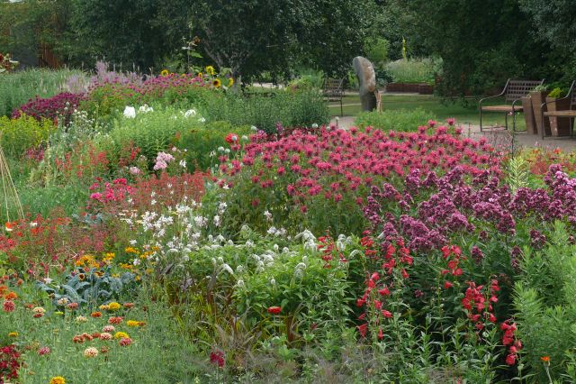 Tyto kultivarové sortimenty pak plynule přechází do velkého trvalkového záhonu, lemujícího průchozí cestu nad americkou prérií.